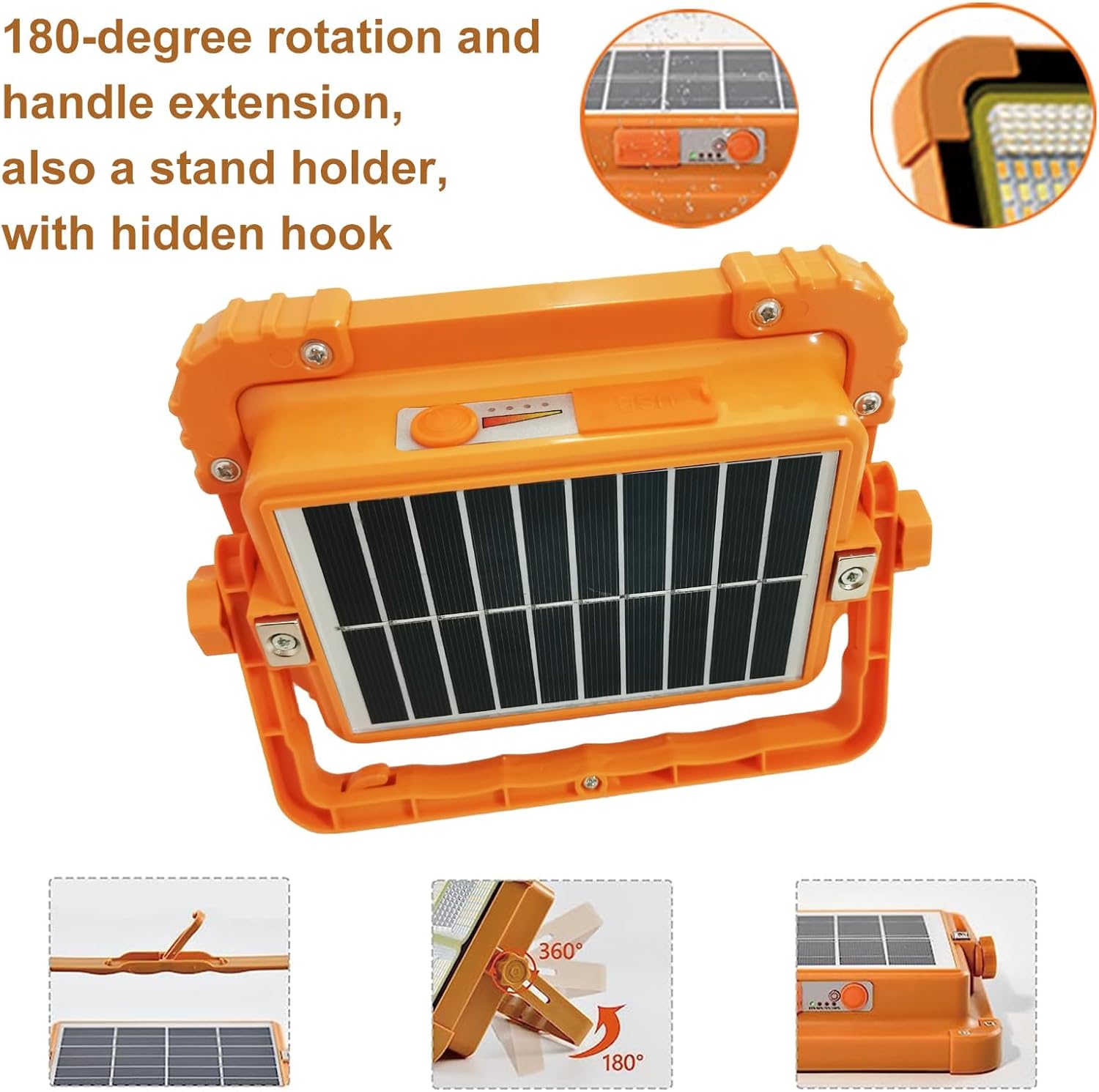 【Rechargeable and USB Port】 The outdoor LED solar work light can be used as a power bank, with a built-in 3000mAh battery, can be recharged via the solar panel. It is convenient to charge your mobile device and other electronic devices in case of emergency.