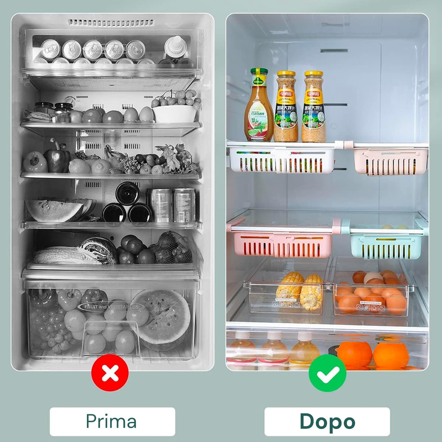 Ordine e Pulizia: Grazie al suo design ben studiato, questo contenitore aiuta a mantenere il frigorifero ordinato e pulito, rendendo la gestione degli alimenti più facile e veloce.