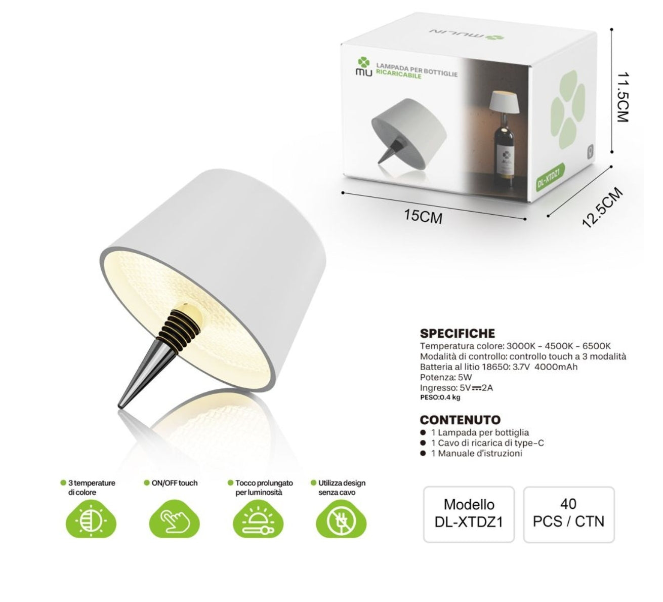 Scopri il futuro dell'illuminazione con la nostra Lampada per Bottiglie XTDZ1, un trionfo del design innovativo. Questo gioiello di tecnologia non solo trasforma istantaneamente qualsiasi bottiglia in una lampada affascinante, ma è anche incredibilmente semplice da usare. grazie alle diverse modalità di illuminazione, potrai scegliere l'atmosfera giusta per ogni momento, dal soffuso bagliore romantico fino alla luminosità vivace per le tue feste.